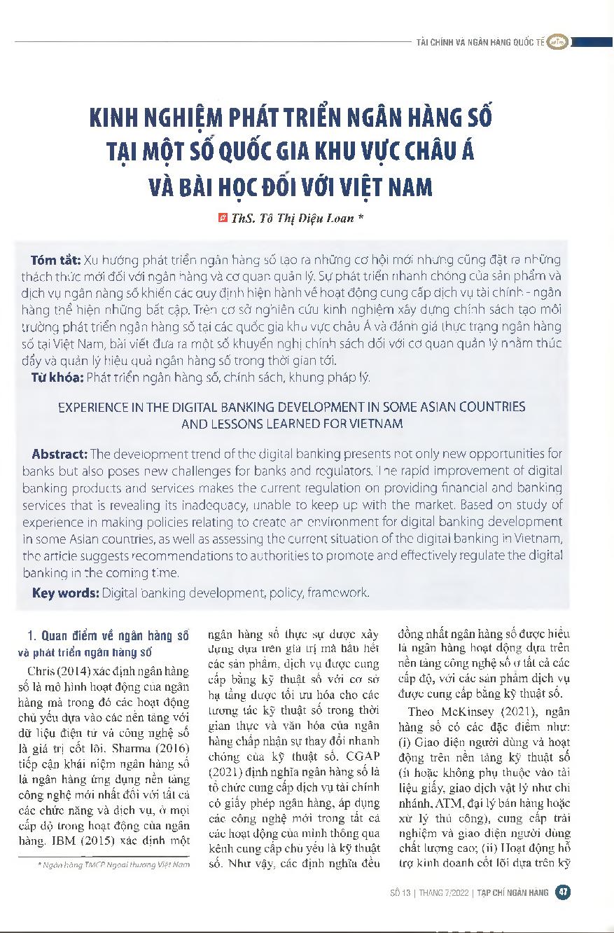 Kinh nghiệm phát triển ngân hàng số tại một số quốc gia khu vực châu Á và bài học đối với Việt Nam = Experience in the digital banking development in some Asian countries and lessons learned for Vietnam