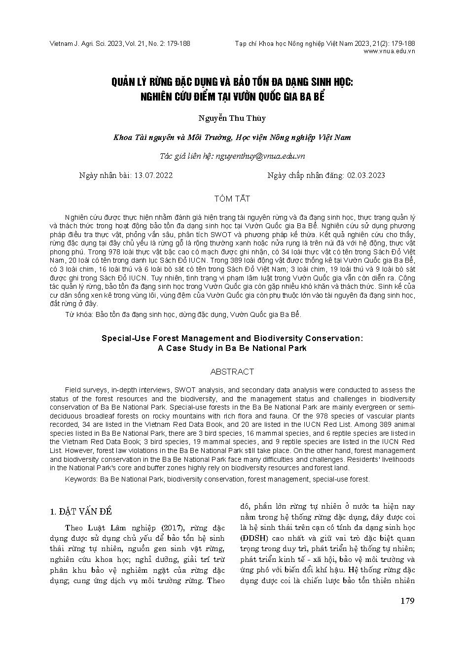 Quản lý rừng đặc dụng và bảo tồn đa dạng sinh học: Nghiên cứu điểm tại Vườn Quốc gia Ba Bể