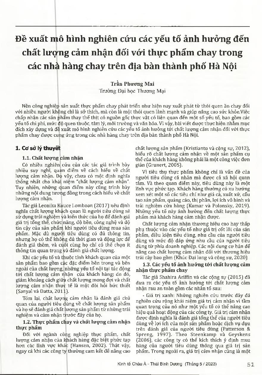 Đề xuất mô hình nghiên cứu các yếu tổ ảnh hưởng đến chất lượng cảm nhận đổi với thực phẩm chay trong các nhà hàng chay trên địa bàn thành phố Hà Nội