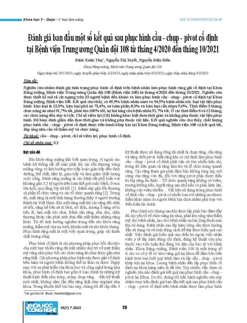 Đánh giá ban đầu một số kết quả sau phục hình cầu - chụp - pivot cố định tại Bệnh viện Trung ương Quân đội 108 từ tháng 4/2020 đến tháng 10/2021 = Initial evaluation of some results after fixed spherical-capture-pivot restorations at the 108 Military Cent
