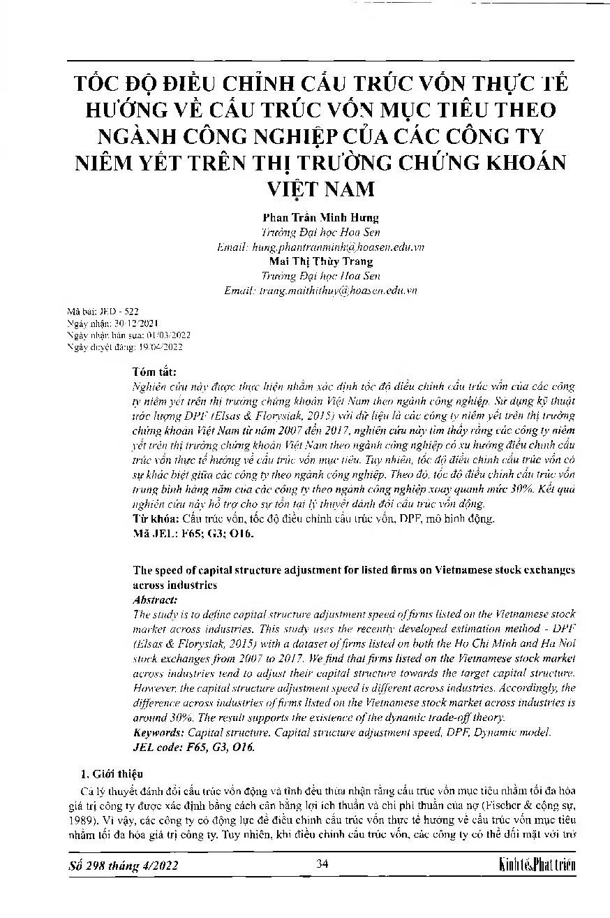 Tốc độ điều chỉnh cấu trúc vốn thực tế hướng về cấu trúc vốn mục tiêu theo ngành công nghiệp của các công ty niêm yết trên thị trường chứng khoán Việt Nam = The speed of capital structure adjustment for listed firms on Vietnamese stock exchanges across in