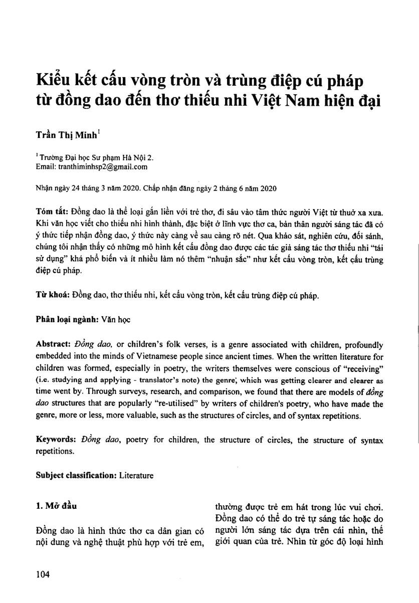 Kiểu kết cấu vòng tròn và trùng điệp cú pháp từ đồng dao đến thơ thiếu nhi Việt Nam hiện đại = Circle structure and syntax match from bronze knife to modern Vietnamese children's poetry