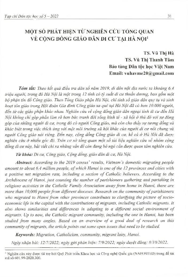 Một số phát hiện từ nghiên cứu tổng quan về cộng đồng giáo dân di cư tại Hà Nội = Some Findings from an Overview of the Studies of the Lay Migrant Community in Hanoi