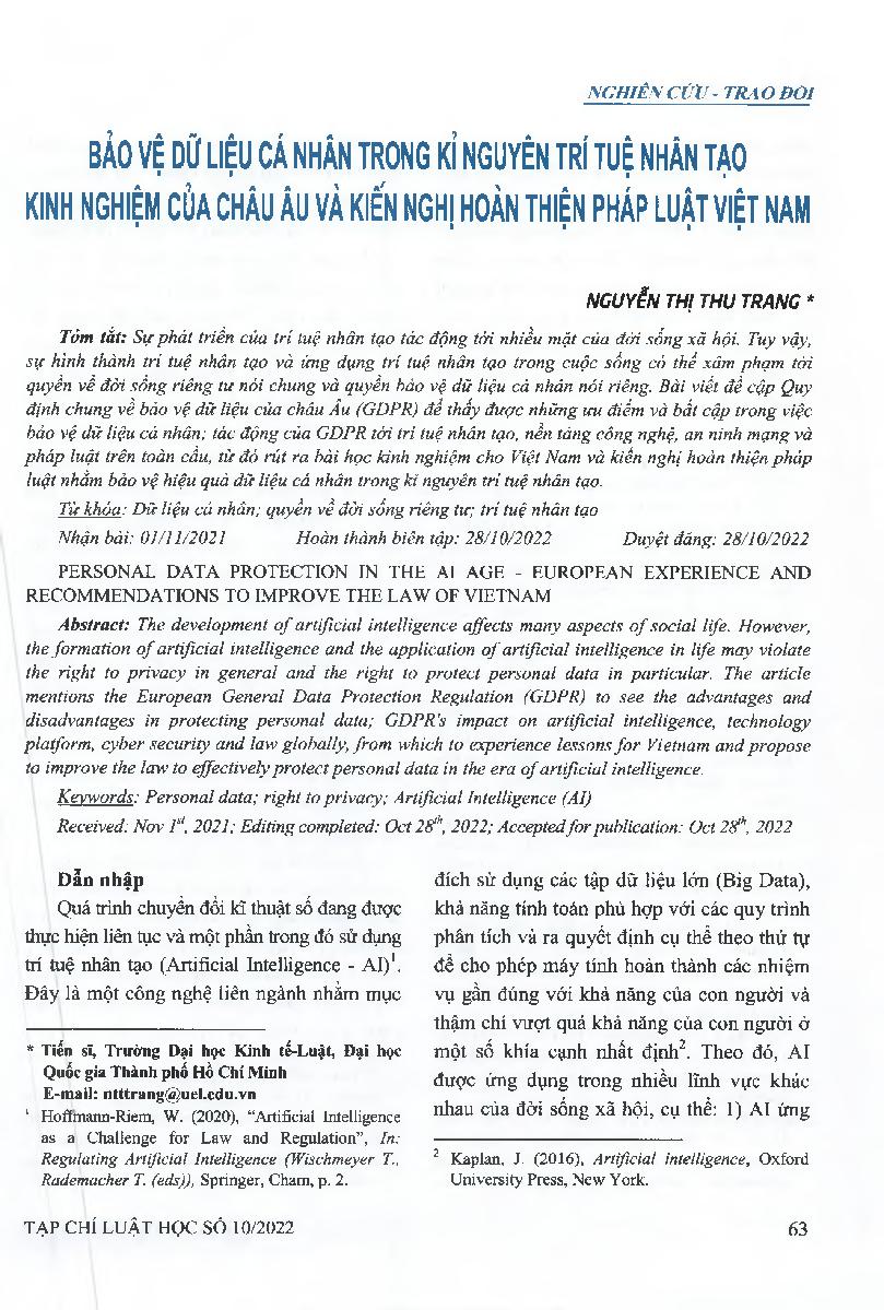 Bảo vệ dữ liệu cá nhân trong kỉ nguyên trí tuệ nhân tạo - Kinh nghiệm của châu Âu và kiến nghị hoàn thiện pháp luật Việt Nam = Personal data protection in the Al age - European experience and recommendations to improve the law of Vietnam