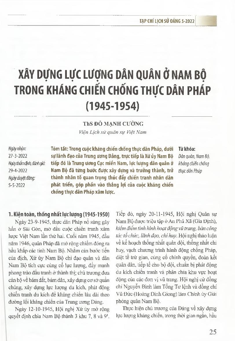 Xây dựng lực lượng dân quân ở Nam Bộ trong kháng chiến chống thực dân Pháp (1945-1954)