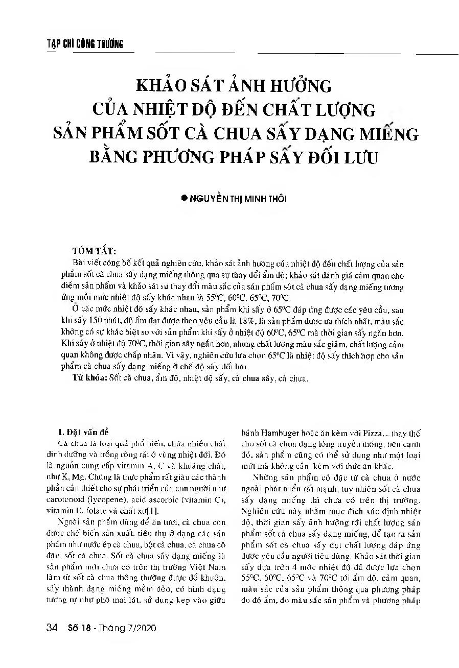 Khảo sát ảnh hưởng của nhiệt độ đến chất lượng sản phẩm sốt cà chua sấy dạng miếng bằng phương pháp sấy đối lưu = Examining the impacts of temperature on the quality of dried sauce tomato flakes with convention drying method