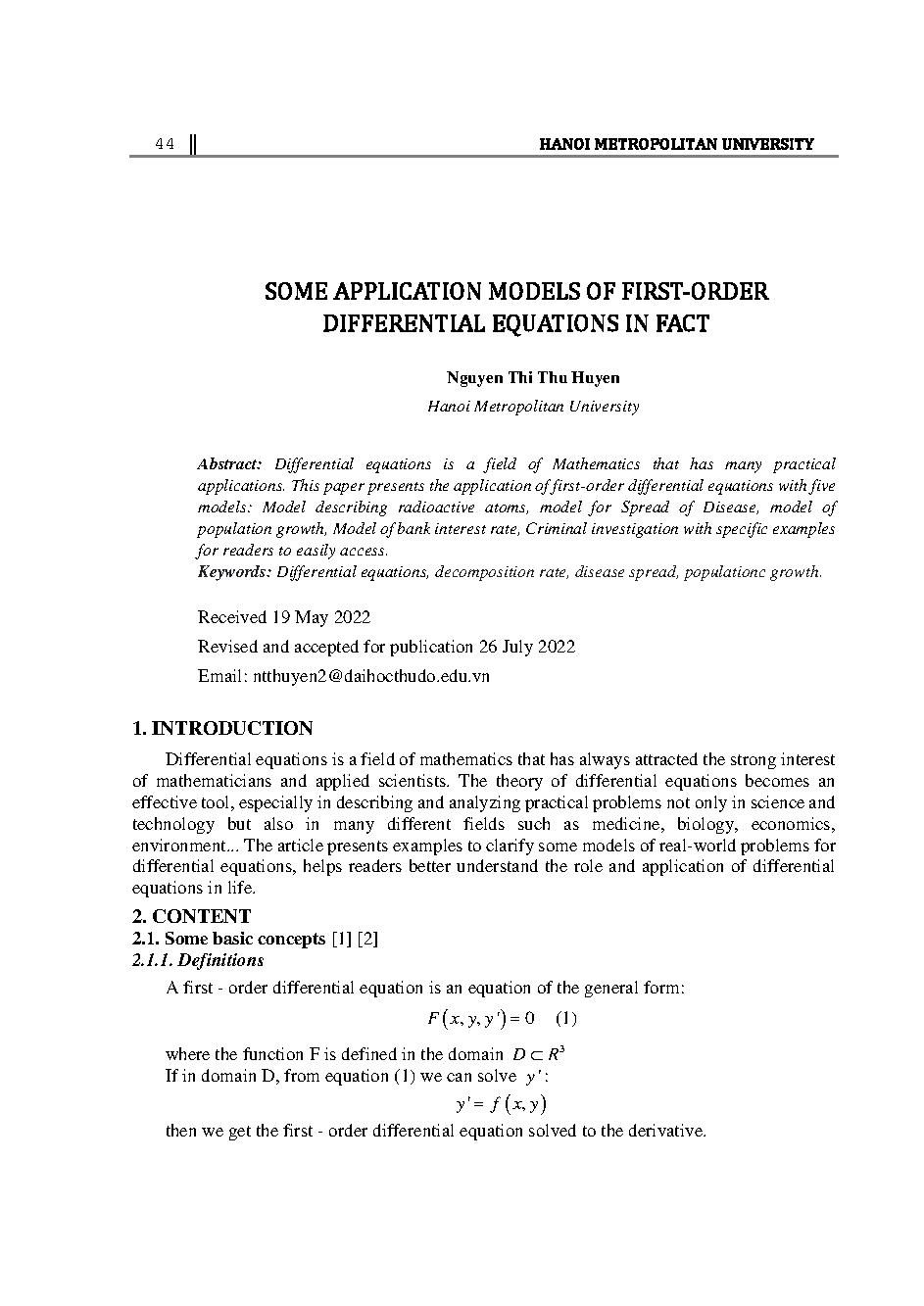 Một số mô hình ứng dụng của phương trình vi phân cấp một trong thực tế = Some application models of first-order differential equations in fact