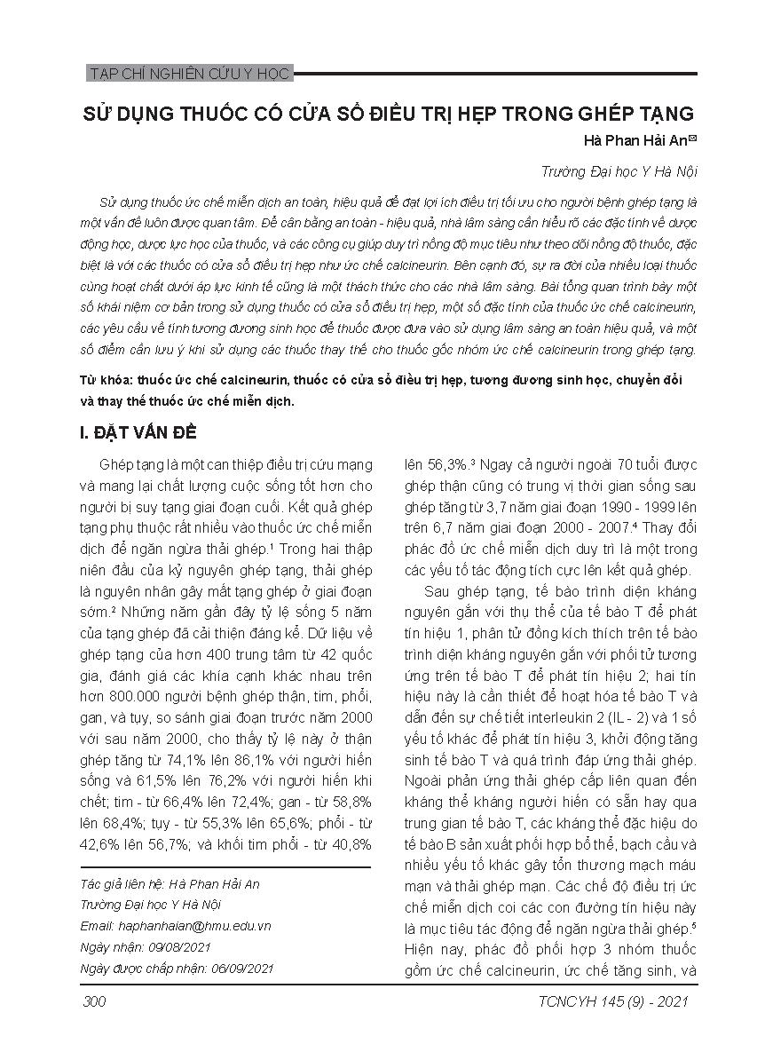 Sử dụng thuốc có cửa sổ điều trị hẹp trong ghép tạng = Use of narrow therapeutic index drugs in organ transplantation