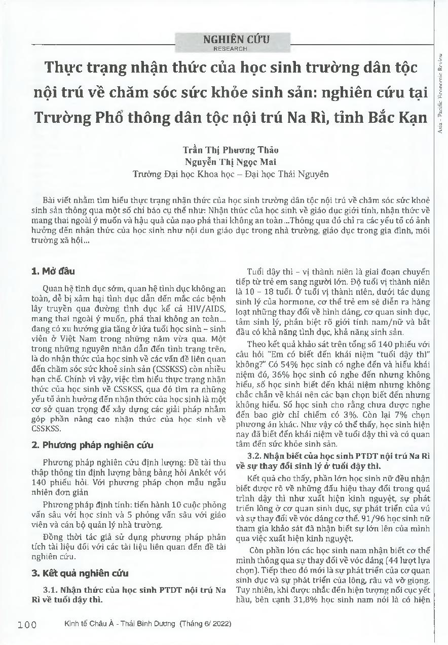 Thực trạng nhận thức của học sinh trường dân tộc nội trú về chăm sóc sức khỏe sinh sản: nghiên cứu tại Trường Phô thông dân tộc nội trú Na Rì, tỉnh Bắc Kạn