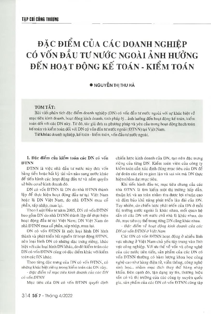 Đặc điểm của các doanh nghiệp có vốn đầu tư nước ngoài ảnh hưởng đến hoạt động kế toán - kiểm toán = Characteristics of foreign-invested enterprises and impacts of these characteristics on the accounting and auditing activities