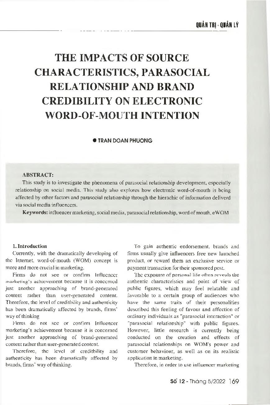 Tác động của đặc điểm nguồn, mối quan hệ xã hội và độ tin cậy của thương hiệu đối với ý định truyền miệng điện tử = The impacts of source characteristics, parasocial relationship and brand credibility on electronic word-of-mouth intention