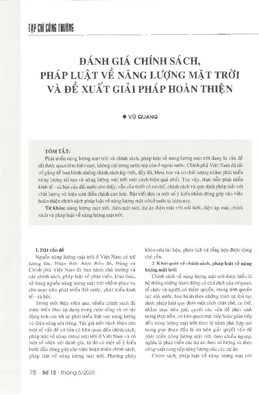 Đánh giá chính sách, pháp luật về năng lượng mặt trời và đề xuất giải pháp hoàn thiện = Assessing the policies and legal regulations on solar energy in Vietnam and proposals to impove these policies and legal regulations