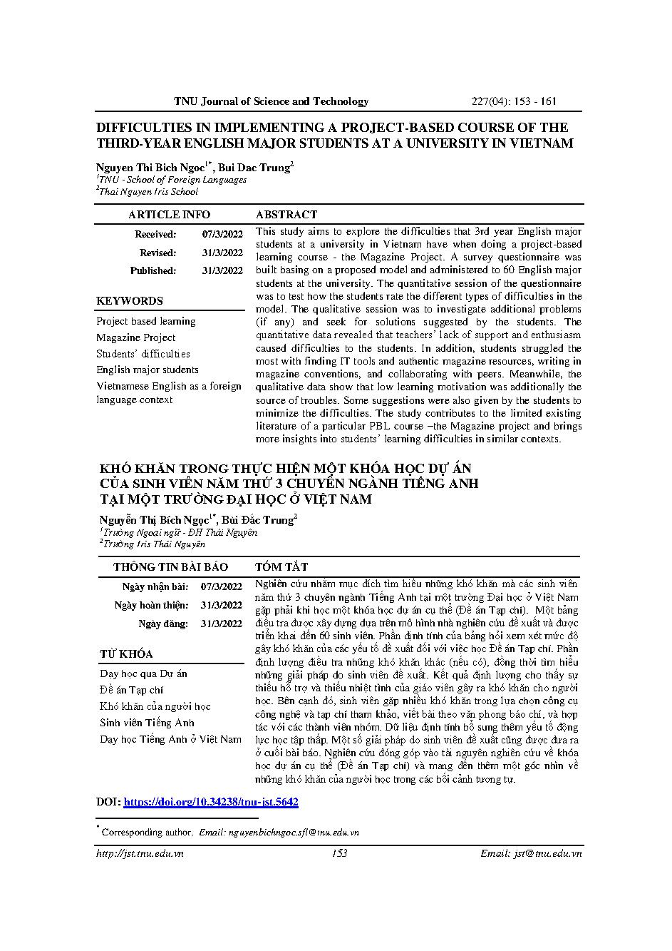 Khó khăn trong thực hiện một khóa học dự án của sinh viên năm thứ 3 chuyên ngành tiếng Anh tại một trường đại học ở Việt Nam = Difficulties in implementing a project-based course of the third-year English major students at a university in Viet Nam