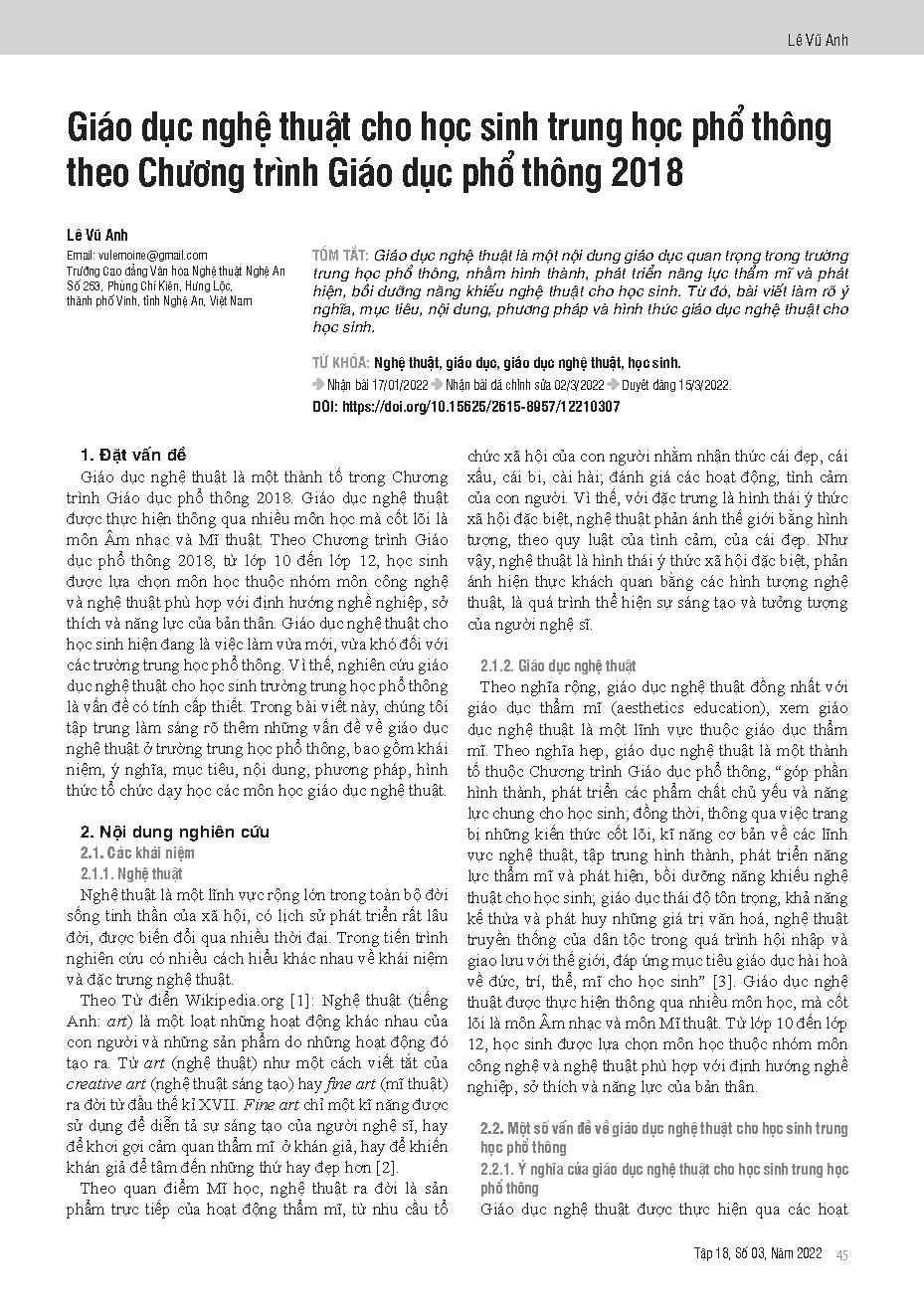 Giáo dục nghệ thuật cho học sinh trung học phổ thông theo Chương trình Giáo dục phổ thông 2018 = Art education for high school students under the general education curriculum 2018