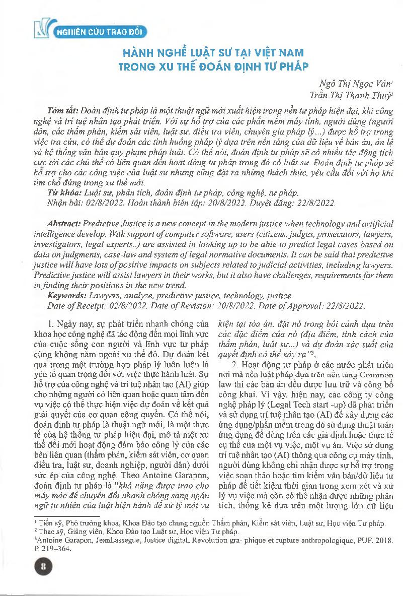 Hành nghề luật sư tại Việt Nam trong xu thế đoán định tư pháp = The lawyer&; 39;s practice in Vietnam in the trend of Predictive Justice