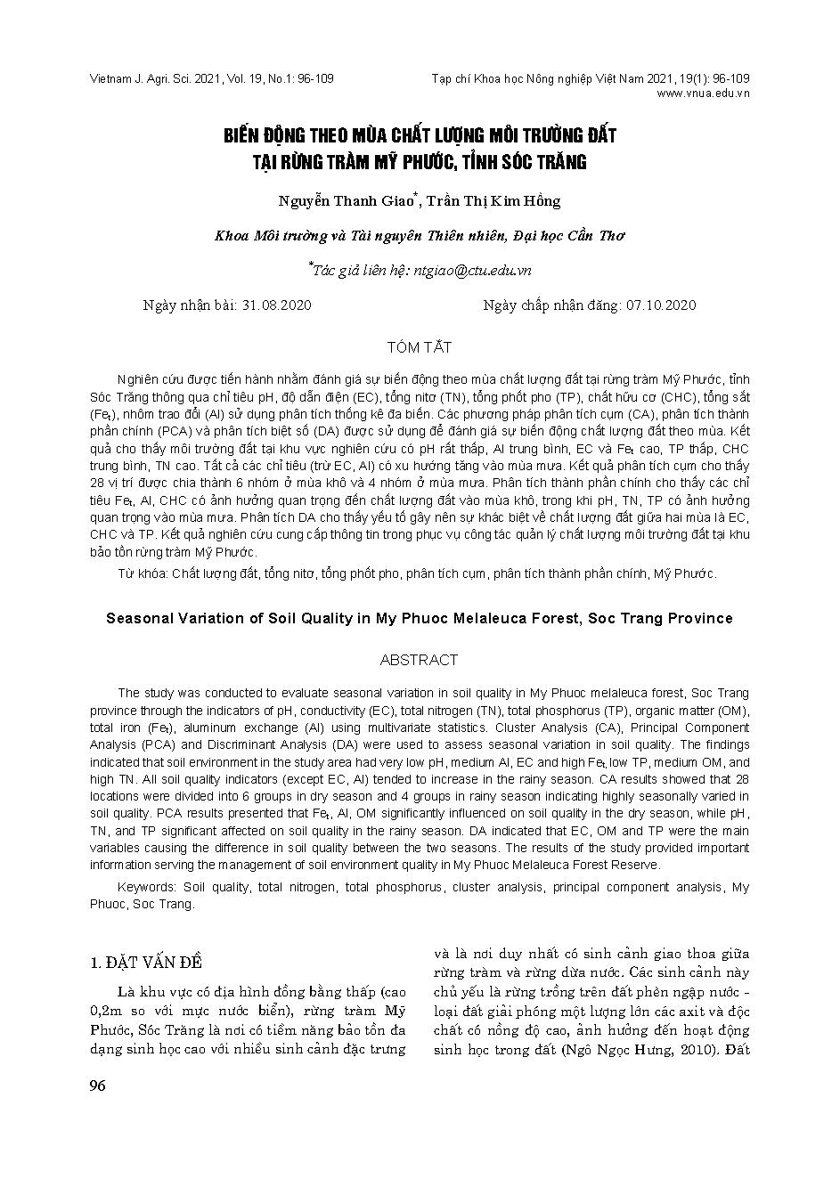 Biến động theo mùa chất lượng môi trường đất tại rừng tràm Mỹ Phước, tỉnh Sóc Trăng = Seasonal variation of soil quality in My Phuoc melaleuca forest, Soc Trang province