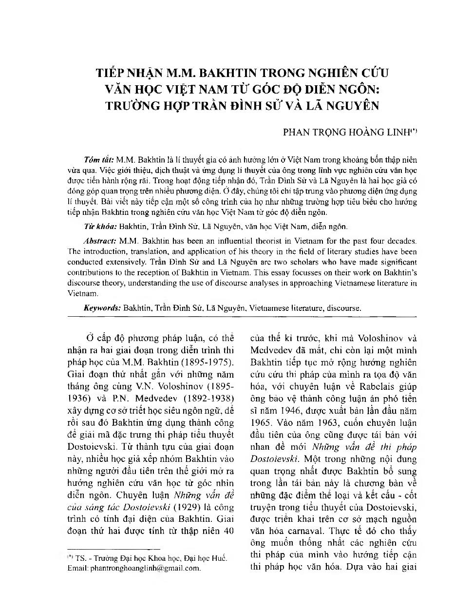 Tiếp nhận M.M. Bakhtin trong nghiên cứu văn học Việt Nam từ góc độ diễn ngôn: trường hợp Trần Đình Sử và Lã Nguyên = The reception of M.M. Bakhtin in studies of Vietnamese literature from discourse studies: Case of Trần Đình Sử and Lã Nguyên