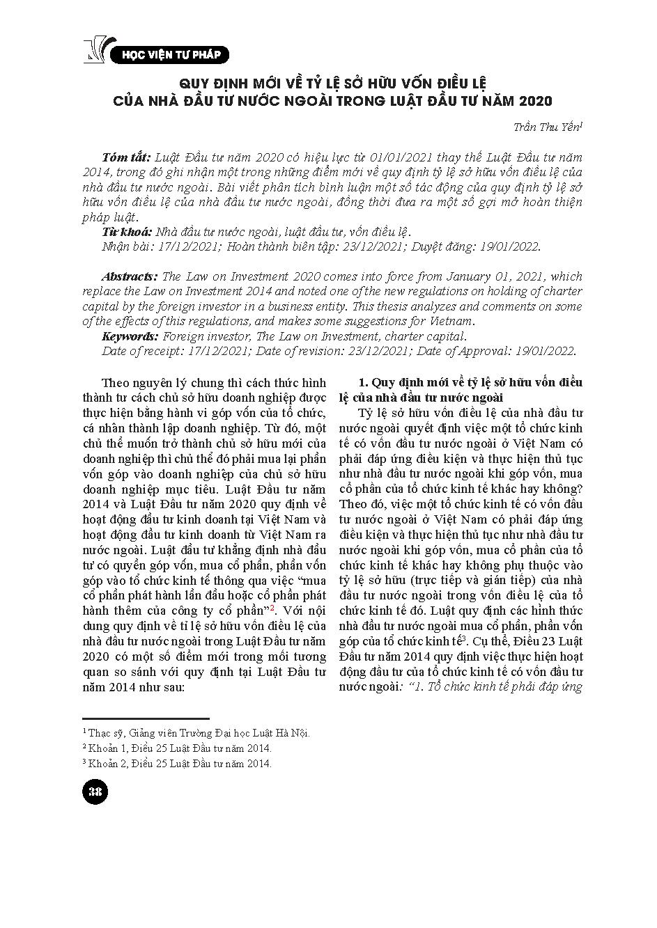 Quy định mới về tỳ lệ sở hữu vốn điều lệ của nhà đau tư nước ngoài trong Luật đầu tư năm 2020 = New regulation on the rate which foreign investors can own in the Law on Investment in 2020