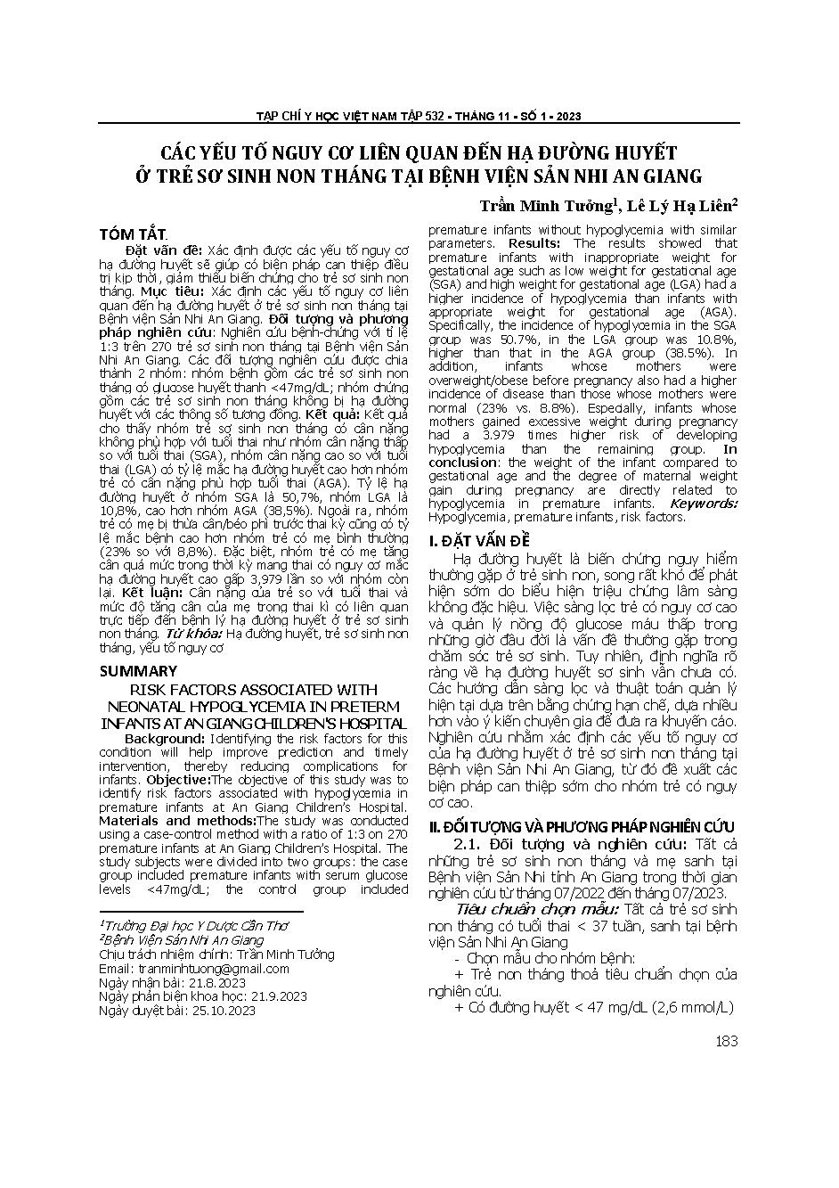 Các yếu tố nguy cơ liên quan đến hạ đường huyết ở trẻ sơ sinh non tháng tại Bệnh viện Sản nhi An Giang = Risk factors associated with neonatal hypoglycemia in preterm infants at An Giang children's hospital