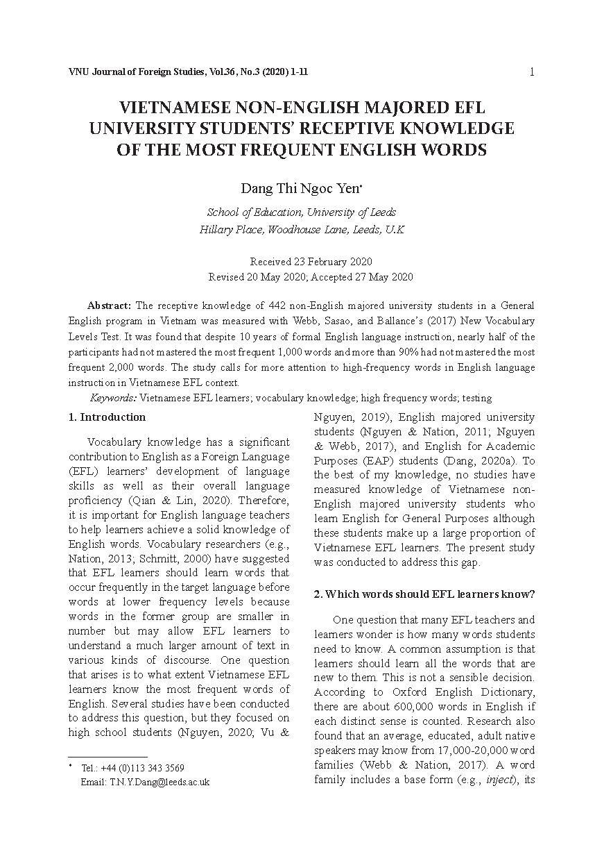 Kiến thức tiếp nhận từ vựng thông dụng trong tiếng Anh của sinh viên Việt Nam hệ tiếng Anh không chuyên = Vietnamese non-English majored EFL university students’ receptive knowledge of the most frequent English words