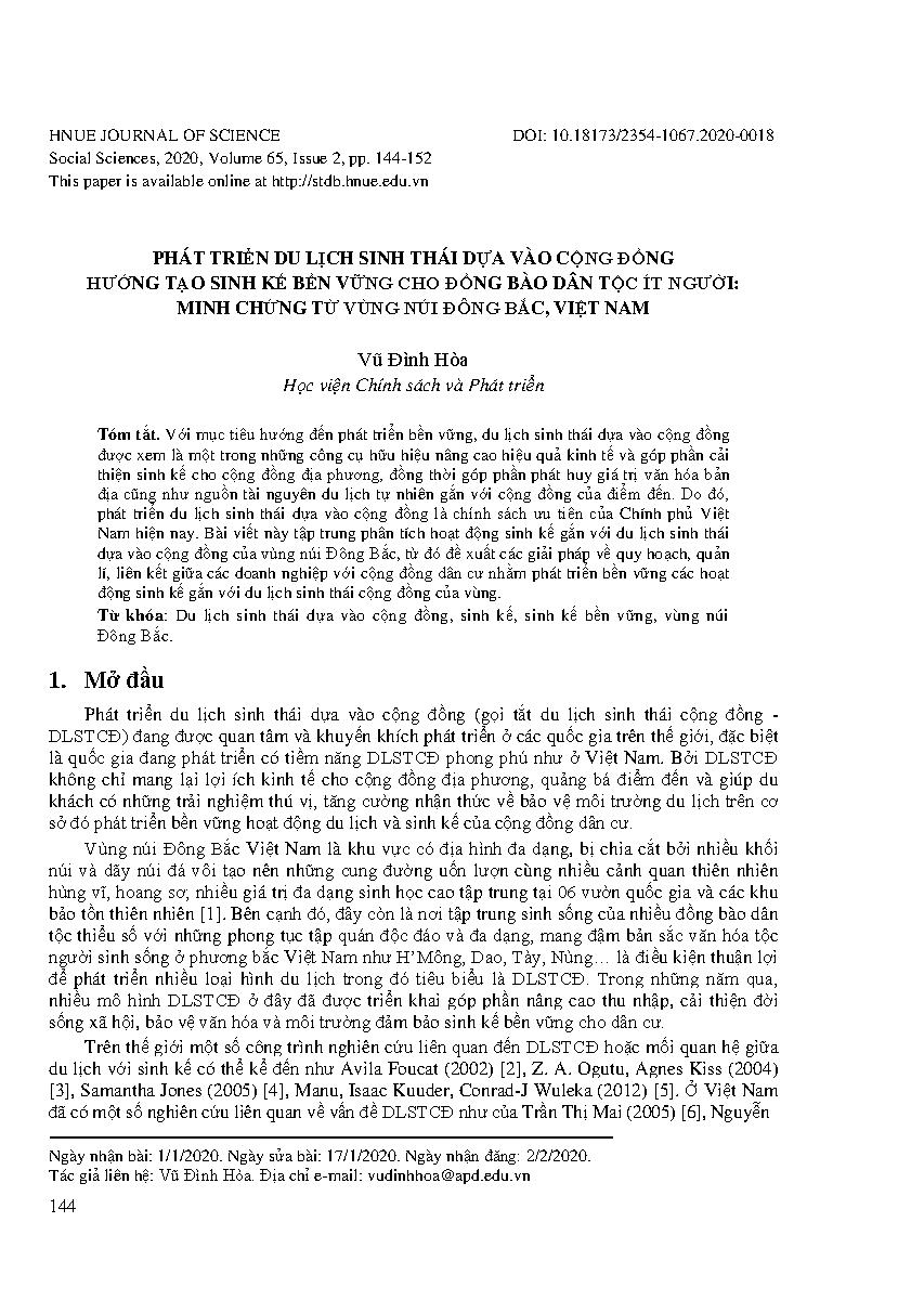 Phát triển du lịch sinh thái dựa vào cộng đồng hướng tạo sinh kế bền vững cho đồng bào dân tộc ít người: minh chứng từ vùng núi Đông Bắc, Việt Nam = Developing community-based eco-tourism creates sustainable livelihoods for ethnic minorities: Evidence from the Northeast mountains of Vietnam