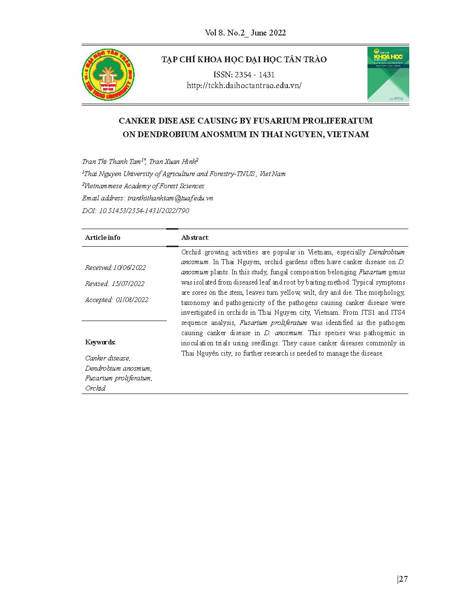 Nấm Fusarium proliferatum gây bệnh loét thân hoa lan phi điệp tại Thái Nguyên = Canker disease causing by Fusarium proliferatum on dendrobium anosmum in Thai Nguyen, Vietnam
