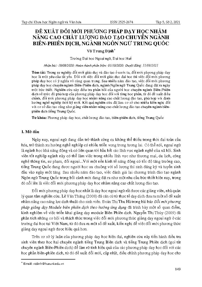 Đề xuất đổi mới phương pháp dạy học nhằm nâng cao chất lượng đào tạo chuyên ngành biên-phiên dịch, ngành ngôn ngữ Trung Quốc = Some suggestions to improve the teaching methods and the training quality of translation interpretation specialization for classes of Chinese
