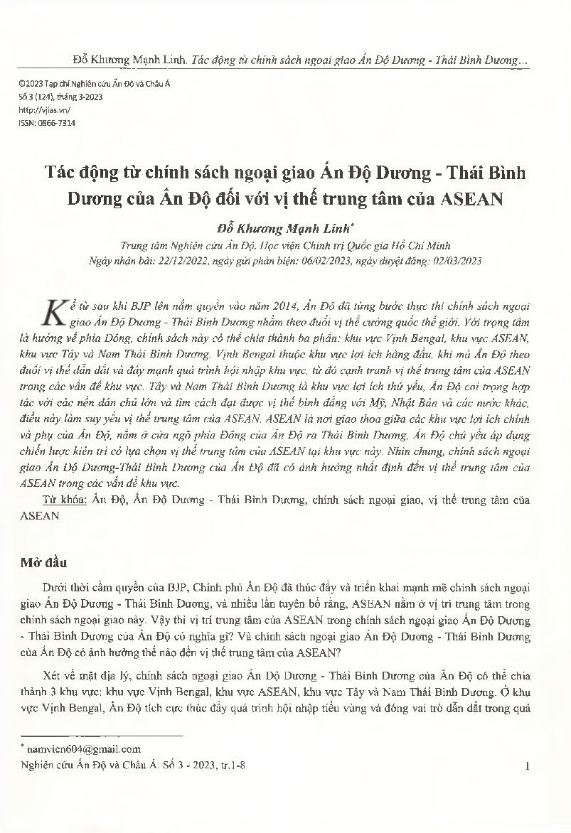 Tác động từ chính sách ngoại giao Ấn Độ Dương - Thái Bình Dương của Ấn Độ đổi với vị thế trung tâm của ASEAN