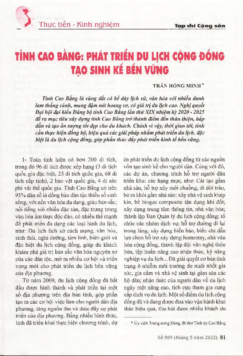 Tỉnh Cao Bằng: Phát triển du lịch cộng đồng tạo sinh kế bền vững = Cao Bang Province: Developing community-based tourism to create sustainable livelihoods