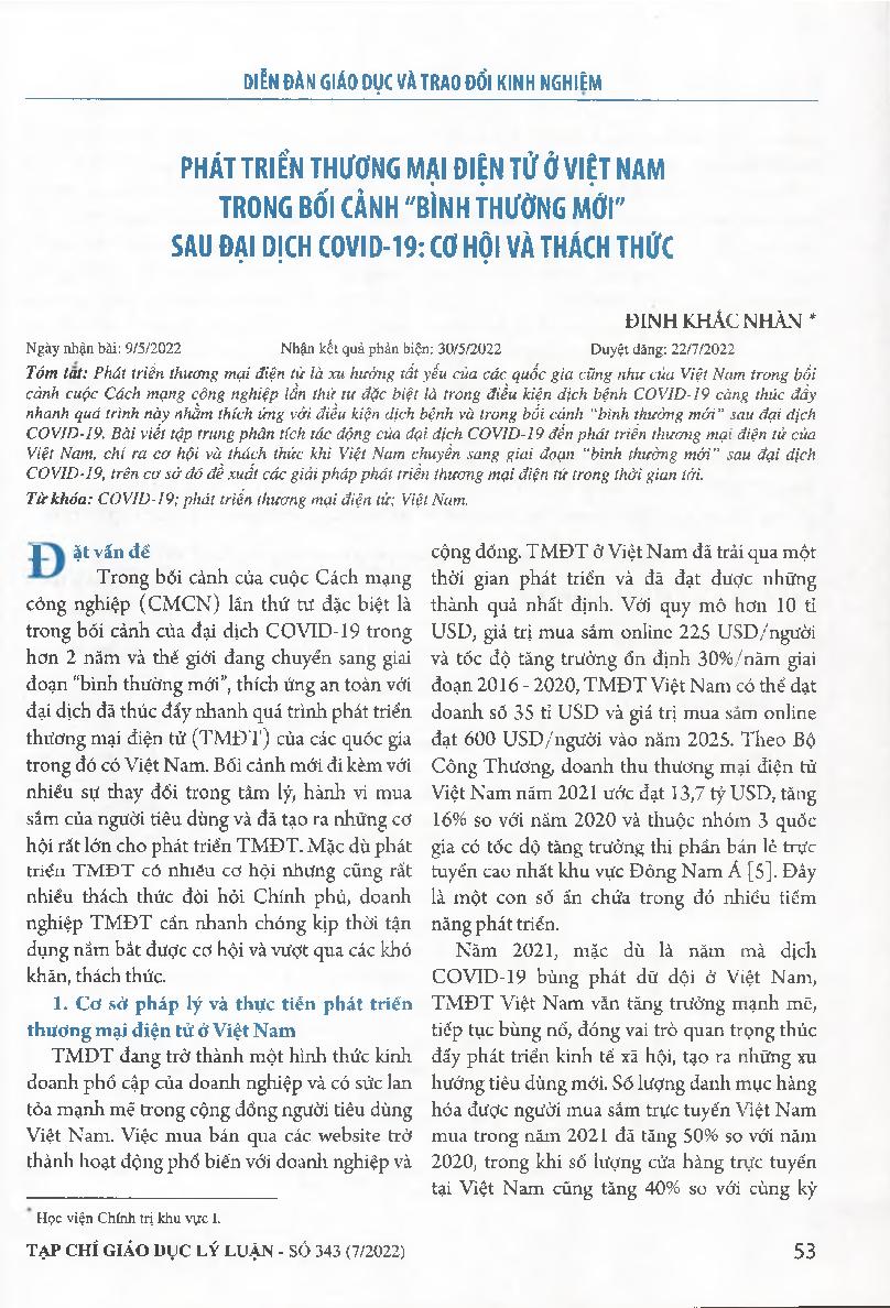Phát triển thương mại điện tử ở Việt Nam trong bối cảnh "bình thường mới" sau đại dịch covid-19: cơ hội và thách thức = Developing e-commerce in Vietnam in the "new normal" context after the COVID-19 pandemic: opportunities and challenges