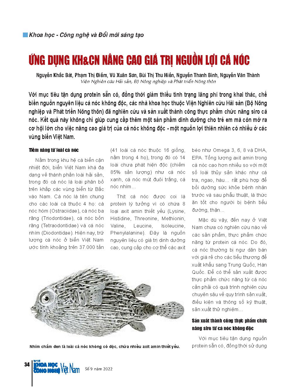 Ứng dụng KH&CN nâng cao giá trị nguồn lợi cá nóc = Application of science and technology to improve the value of puffer fish resources