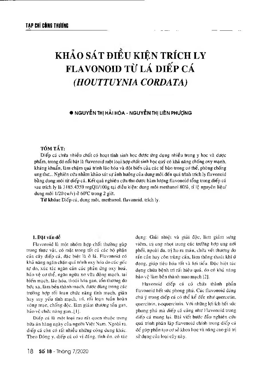 Khảo sát điều kiện trích ly flavonoid từ lá diếp cá (Houttuynia Cordata) = A study on the conditions of extracting flavonoid from Houttuynia Cordata
