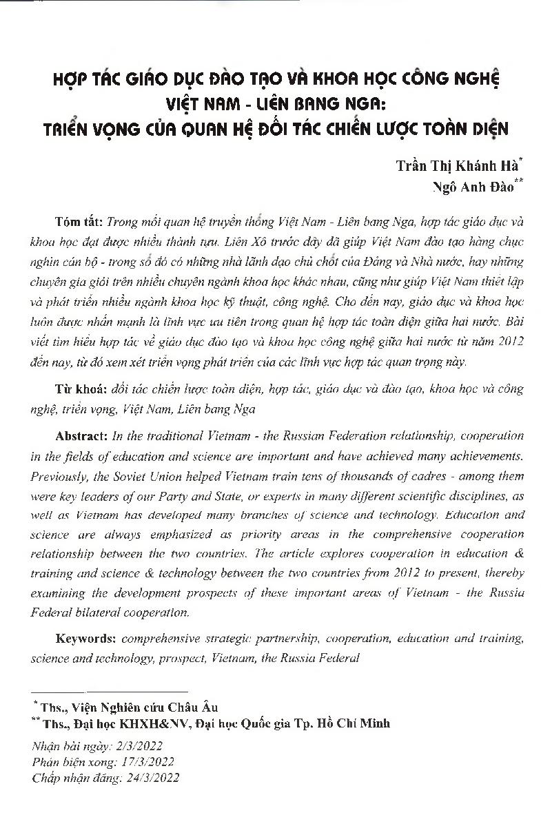 Hợp tác giáo dục đào tạo và khoa học công nghệ Việt Nam - Liên bang Nga: Triển vọng của quan hệ đối tác chiến lược toàn diện = Cooperation in the fields of education-training and science-technology between Vietnam and Russia Federal: Prospect of the compr