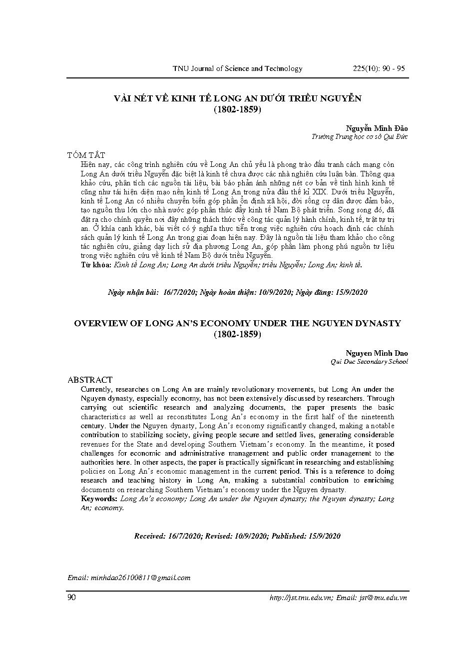 Vài nét về kinh tế Long An dưới triều Nguyễn (1802-1859) = Overview of Long An’s economy under the Nguyen dynasty (1802-1859)