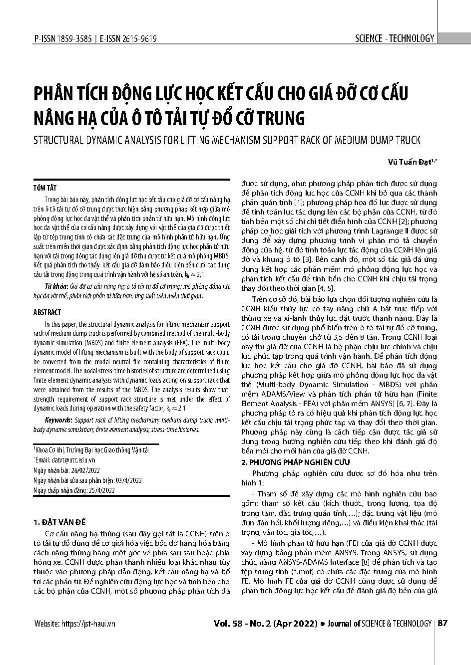 Phân tích động lực học kết cấu cho giá đỡ cơ cấu nâng hạ của ô tô tải tự đổ cỡ trung = Structural dynamic analysis for lifting mechanism support rack of medium dump truck