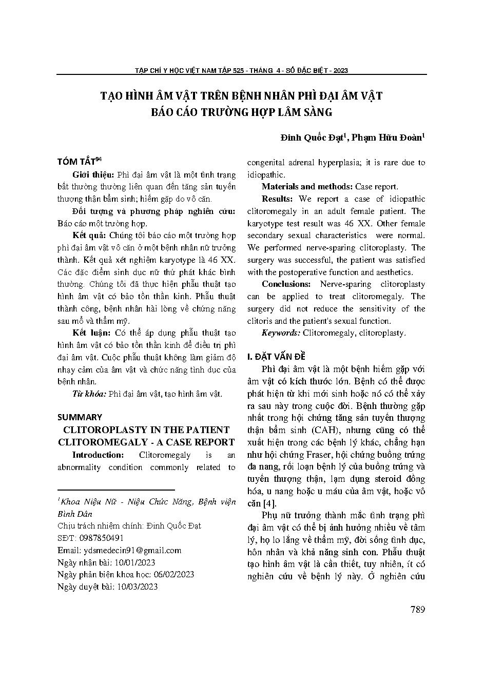 Tạo hình âm vật trên bệnh nhân phì đại âm vật báo cáo trường hợp lâm sàng