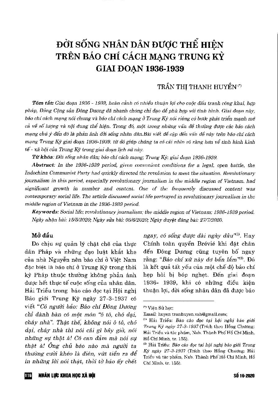 Đời sống nhân dân được thể hiện trên Báo chí cách mạng Trung Kỳ giai đoạn 1936-1939 = Social life in revolutionary journalism in the middle region of Vietnam in the 1936-1939 period