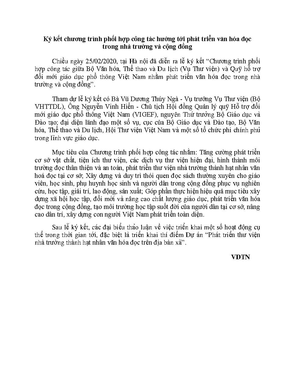 Ký kết chương trình phối hợp công tác hướng tới phát triển văn hóa đọc trong nhà trường và cộng đồng = The signing ceremony of the Cooperation Program towards reading culture development in schools and the community