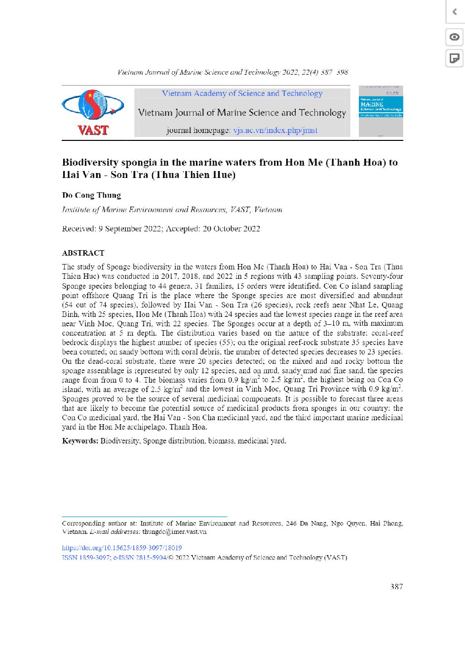 Đa dạng sinh học bọt biển vùng biển từ Hòn Mê (Thanh Hóa) đến Hải Vân - Sơn Trà (Thừa Thiên Huế) = Biodiversity spongia in the marine waters from Hon Me (Thanh Hoa) to Hai Van - Son Tra (Thua Thien Hue)
