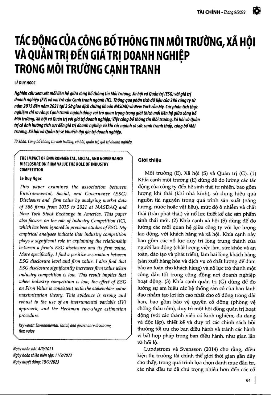 Tác động của công bố thông tin môi trường, xã hội và quản trị đến giá trị doanh nghiệp trong môi trường cạnh tranh