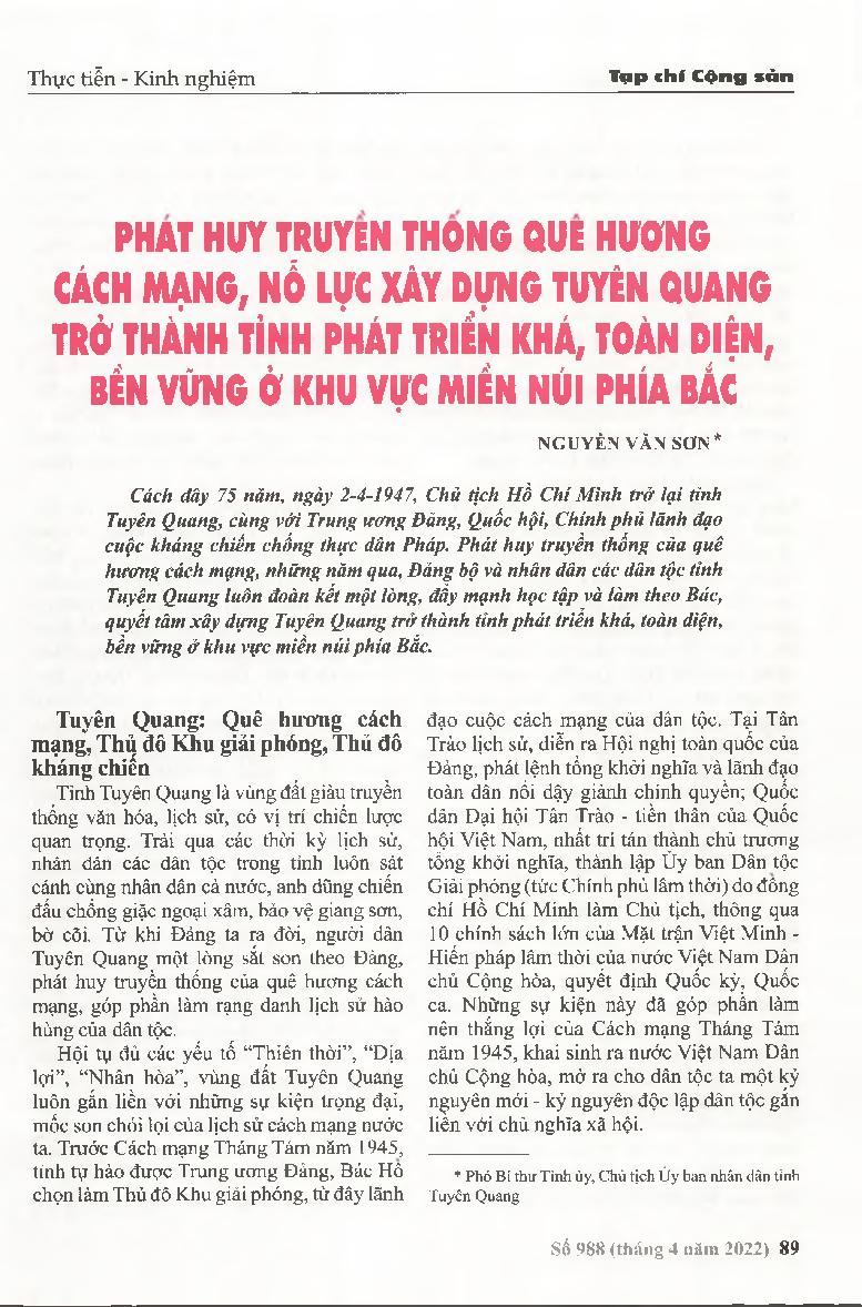 Phát huy truyền thống quê hương cách mạng, nỗ lực xây dựng Tuyên Quang trở thành tỉnh phát triển khá, toàn diện, bền vững ở khu vực miền núi phía Bắc = Promoting the tradition of the revolutionary homeland, striving to build Tuyen Quang into a fairly, com
