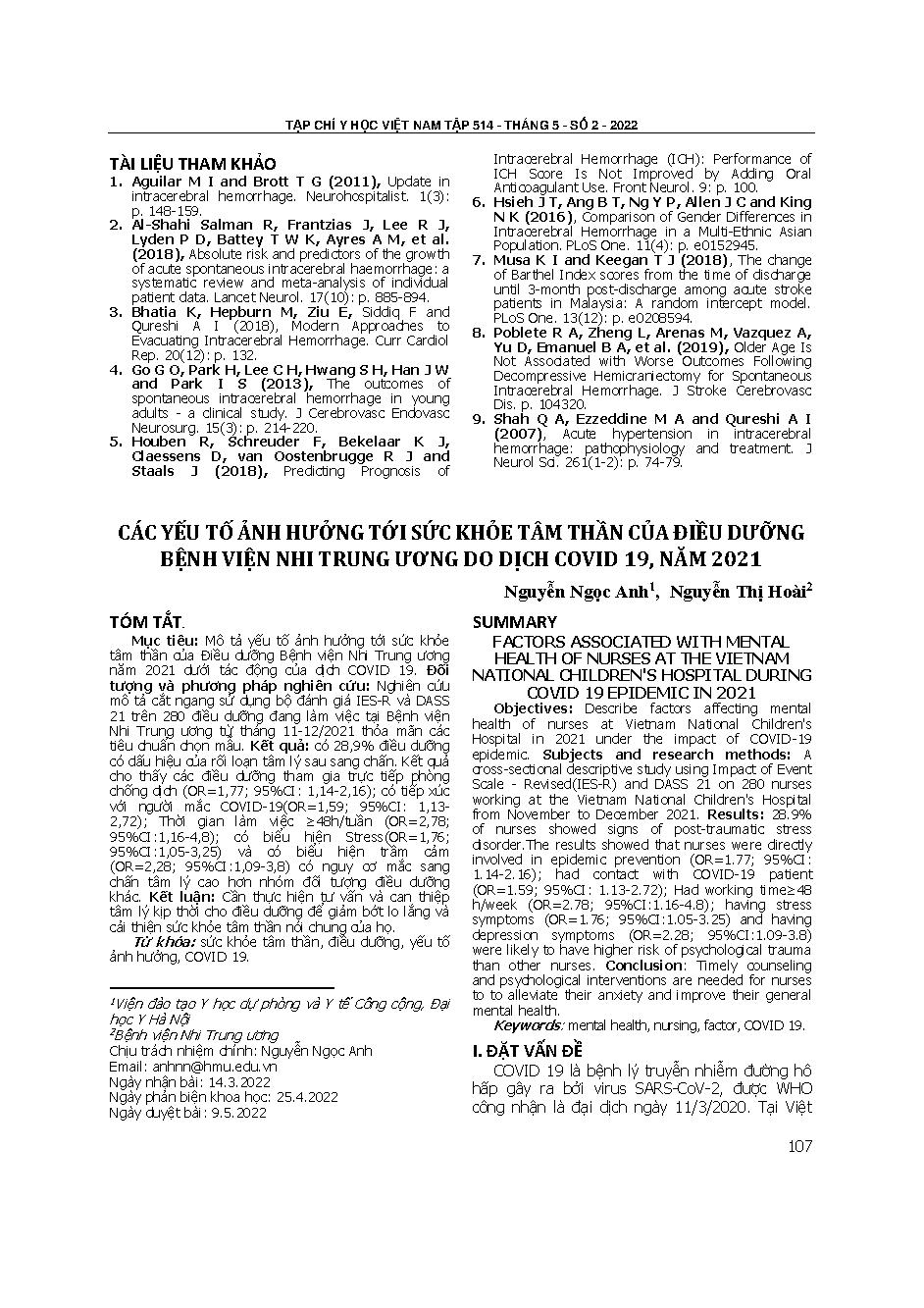 Các yếu tố ảnh hưởng tới sức khỏe tâm thần của điều dưỡng Bệnh viện Nhi Trung ương do dịch Covid 19, năm 2021 = Factors associated with mental health of nurses at the Vietnam national children&; 39;s hospital during Covid 19 epidemic in 2021