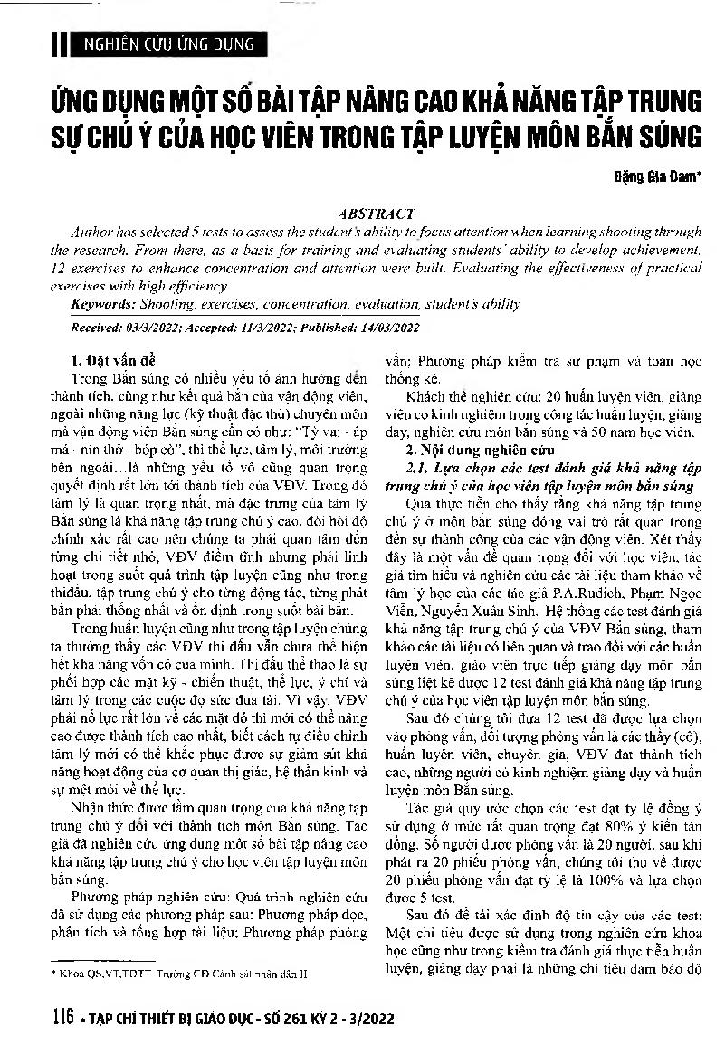Ứng dụng một số bài tập nâng cao khả năng tập trung chú ý của học viên trong tập luyện môn bắn súng = Applying some exercises to improve concentration and attention of students in practicing shooting subject