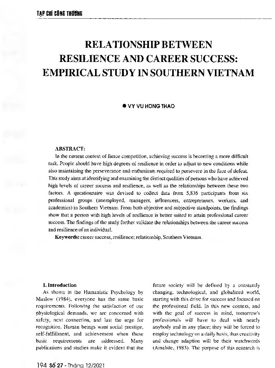 Mối quan hệ giữa tính kiên cường và sự thành công nghề nghiệp: Nghiên cứu điển hình tại Miền Nam Việt Nam = Relationship between resilience and career success: Empirical study in southern Vietnam