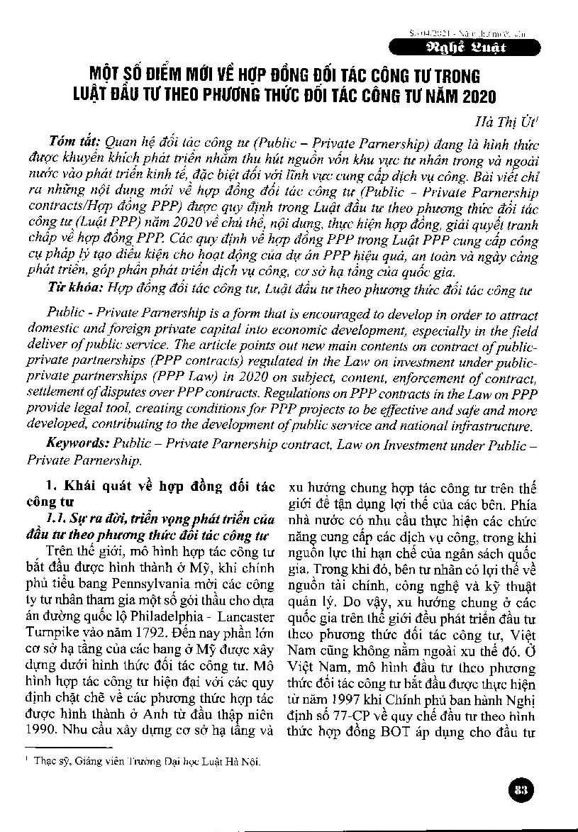 Một số điểm mới về hợp đồng đối tác công tư trong Luật đầu tư theo phương thức đối tác công tư năm 2020 = Some new points on Private-Public contracts in the Law on Investment under Private-Public Partnership in 2020