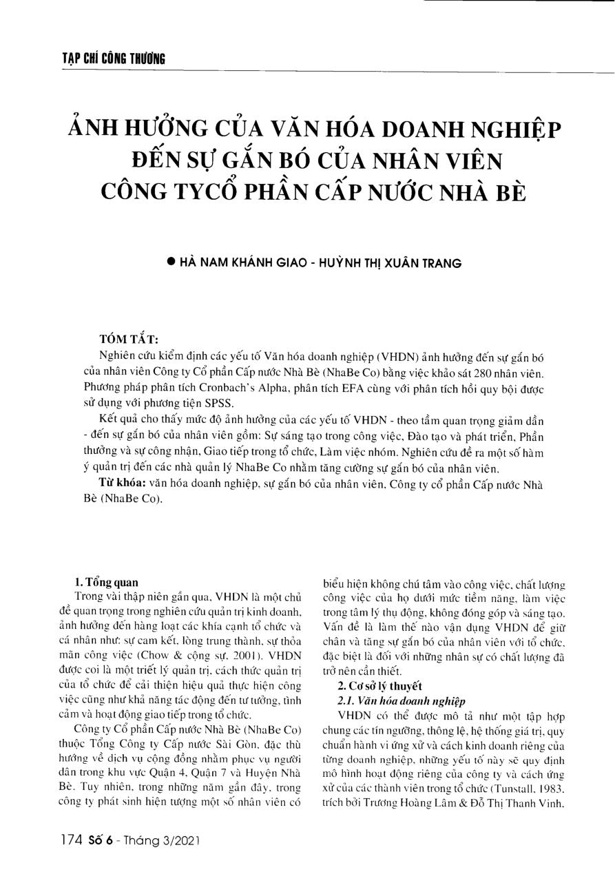 Ảnh hưởng của văn hóa doanh nghiệp đến sự gắn bó của nhân viên công ty cổ phần Cấp nước Nhà Bè = The effect of corporate culture factors on staff commitment at Nha Be Water Supply Joint stock Company