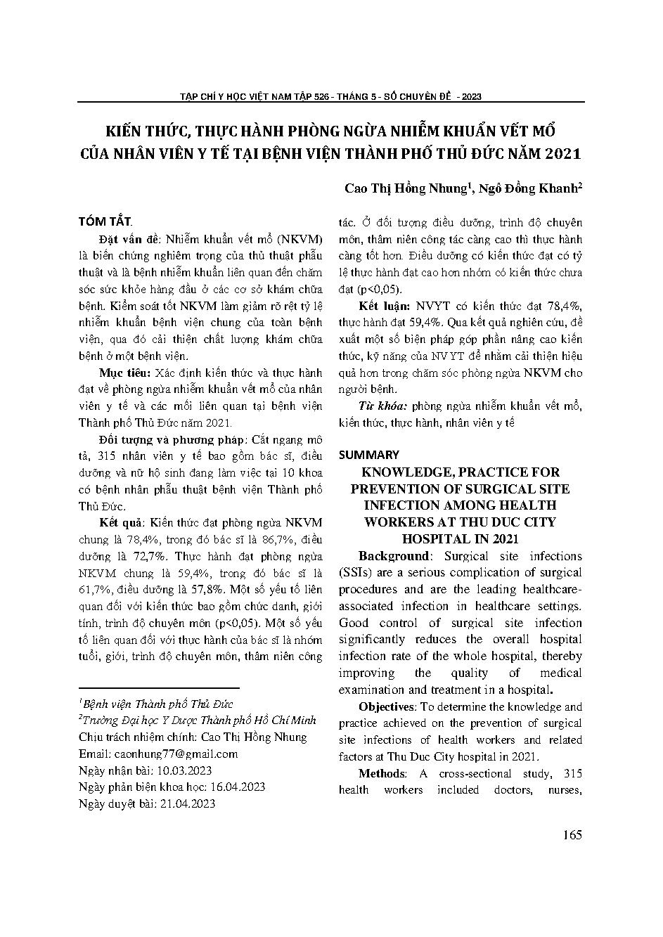 Kiến thức, thực hành phòng ngừa nhiễm khuẩn vết mổ của nhân viên y tế tại bệnh viện thành phố thủ đức năm 2021