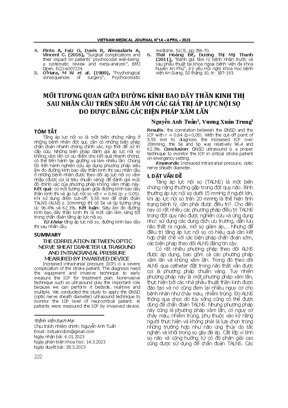 Mối tương quan giữa đường kính bao dây thần kinh thị sau nhãn cầu trên siêu âm với các giá trị áp lực nội sọ đo được bằng các biện pháp xâm lấn = The correlation between optic nerve sheat diameter ultrasound and intracranial pressure measured by invasived