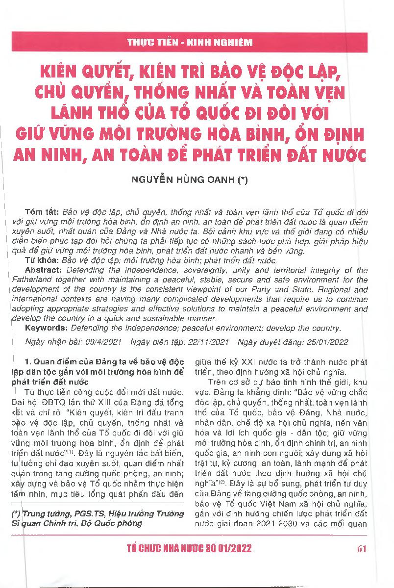 Kiện quyết, kiên trì bảo vệ độc lập, chủ quyền, thống nhất và toàn vẹn lãnh thổ của tổ quốc đi đôi với giữ vững môi trường hòa bình, ổn định an ninh, an toàn để phát triển đất nước = Determinedly and persistently defend the independence, sovereignty, unit