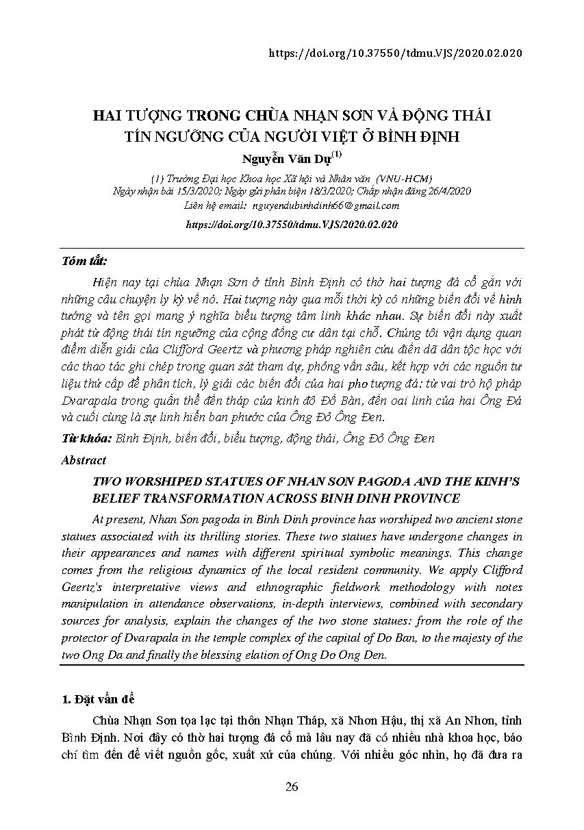 HAI TƯỢNG TRONG CHÙA NHẠN SƠN VÀ ĐỘNG THÁI TÍN NGƯỠNG CỦA NGƯỜI VIỆT Ở BÌNH ĐỊNH = TWO WORSHIPED STATUES OF NHAN SON PAGODA AND THE KINH’S BELIEF TRANSFORMATION ACROSS BINH DINH PROVINCE